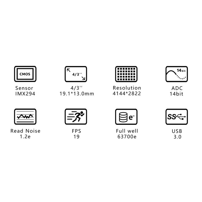 Les caméras équipées d'un capteur IMX 294 en version couleur sont parfaitement adaptées aux prises de vues du ciel profond en RGB. Par contre, l'usage de filtres H-Alpha avec ce capteur couleur cause l'apparition d'artefacts très difficiles à éliminer au traitement. Cette caméra n'est donc pas adaptée à l'astrophotographie avec des filtres H-Alpha à bande étroite, ou des filtres à bandes étroites multiples (Triad...etc.)