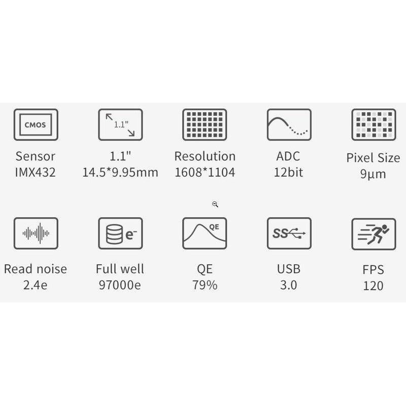 L'ASI 432MM est équipée d'un capteur Sony IMX432 moderne et séduit surtout par son grand champ d'image, sa fréquence d'enregistrement élevée et l'absence totale de lueur d'amplificateur (Amp-Glow). Cette caméra est donc très intéressante non seulement pour les prises de vue du système planétaire et de notre soleil, mais aussi pour les expositions longues (photographie DeepSky).