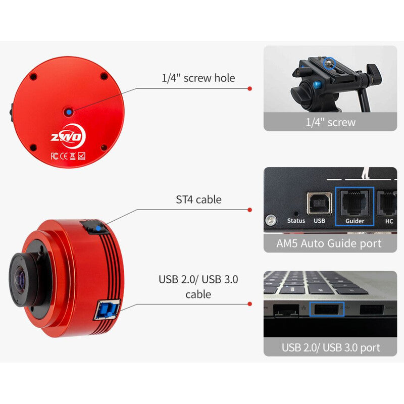 Avec son grand capteur, cette caméra monochromatique ZWO est idéale pour photographier le soleil et la lune, mais son faible bruit la rend également très performante pour l'astrophotographie du ciel profond.