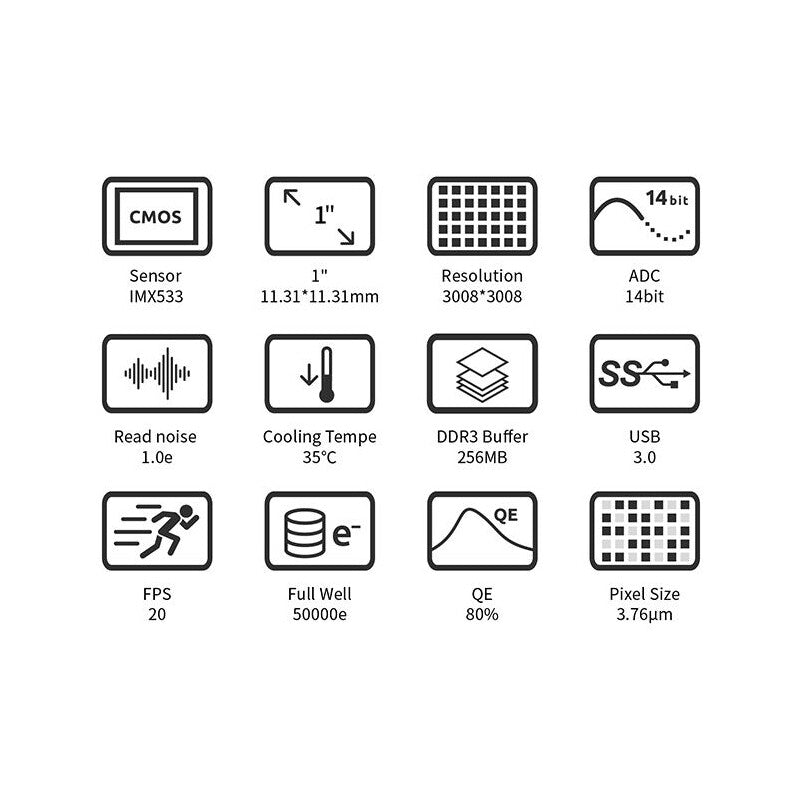 - Haute résolution grâce à des pixels de 3,76 µm - idéal pour les télescopes lumineux et nets, tels que les Apos, Hyperstar, Celestron Faststar, les télescopes Newton lumineux