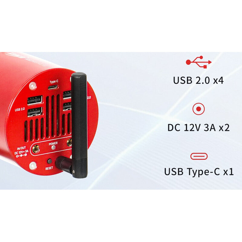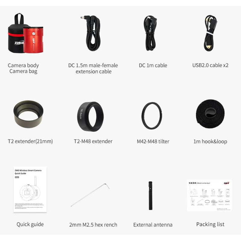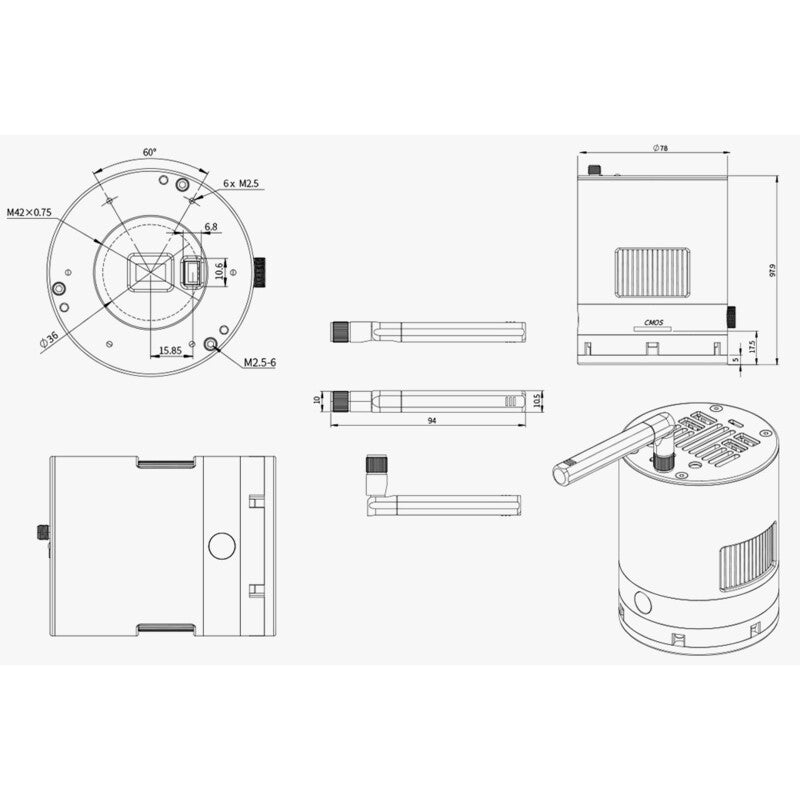WLAN double bande: l'antenne externe double bande, qui prend en charge les fréquences 2,4 GHz et 5 GHz, permet une utilisation stable et fluide de la caméra dans un rayon de 20 mètres. Avec l'application ASIAir de ZWO, vous pouvez contrôler la caméra et visualiser les images facilement sur votre Smartphone.