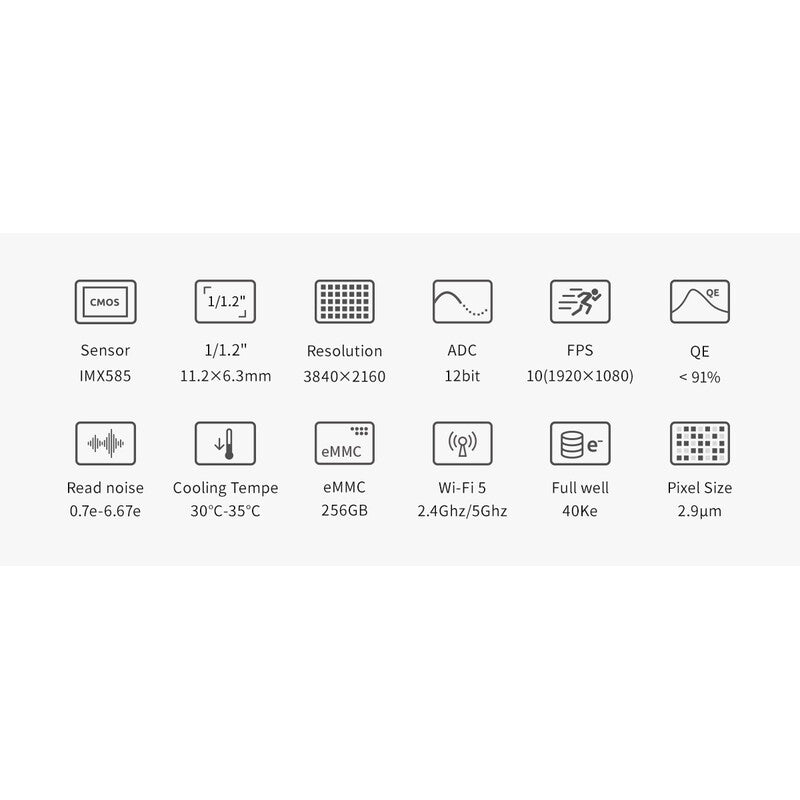 L'un des avantages du capteur CMOS rétroéclairé est le faible bruit de lecture et la sensibilité améliorée. Sony utilise notamment la technologie STARVIS 2 pour le capteur IMX585, qui garantit une excellente visibilité même en cas de faible éclairage. Vous pouvez obtenir un rendement lumineux très élevé pour les prises de vue astronomiques et une qualité d'image élevée non seulement dans la lumière visible, mais aussi dans le proche infrarouge (pour réduire le seeing). De plus, le faible bruit de lecture et la capacité Full Well élevée garantissent une plage dynamique plus large. Combinée au grand champ de vision offert par le grand format du capteur, l'ASI585MC est non seulement idéale pour les prises de vue du soleil, de la lune et des planètes, mais peut également être utilisée comme caméra de streaming en direct.