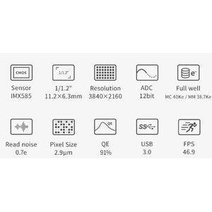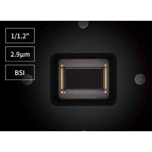 La caméra est équipée d'un capteur Sony IMX585 moderne et convainc surtout par sa haute résolution (pixels de 2,9 µm), sa fréquence d'images élevée et l'absence totale de rémanence de l'amplificateur (Amp Glow). Cela rend cette caméra très intéressante non seulement pour les planètes, le soleil et la lune, mais aussi pour les expositions longues (photographie du ciel profond). Le capteur est suffisamment grand pour de nombreux objets du ciel profond, même sans l'utilisation d'un correcteur supplémentaire.