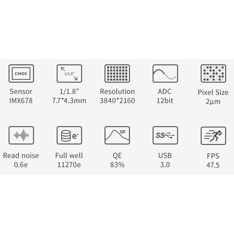 Cette caméra CMOS non refroidie offre une très haute résolution et est adaptée à la photographie lunaire et planétaire, ainsi que, dans une moindre mesure, à la photographie du ciel profond.