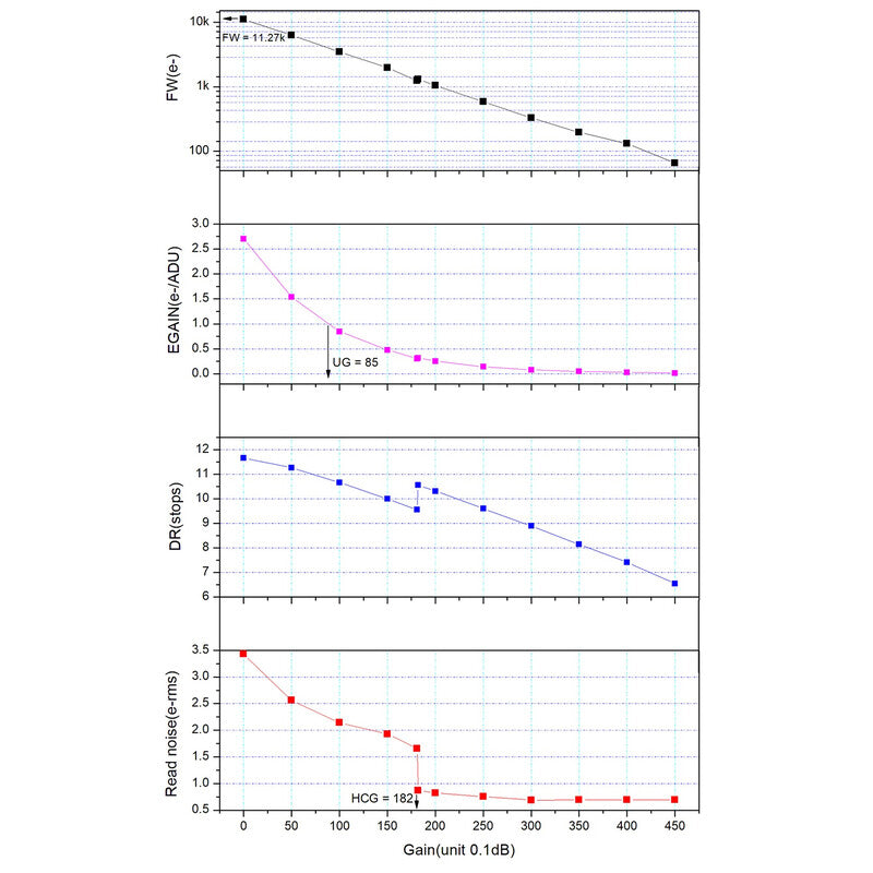 L'ASI 678MC dispose d'un mode High Gain qui s'active à partir d'une valeur de gain de 182, réduit considérablement le bruit de lecture et augmente ainsi la plage dynamique d'un diaphragme.
